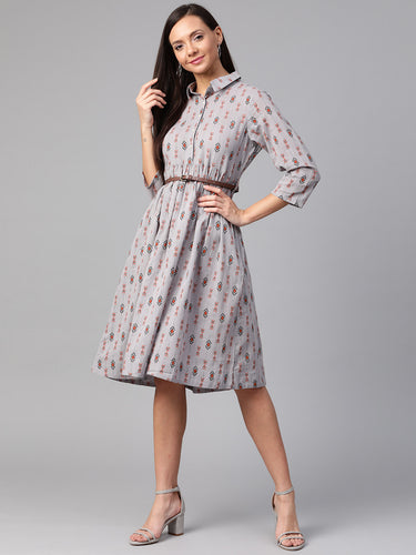 Queen ellie Women Grey & Rust Orange Printed Shirt Dress