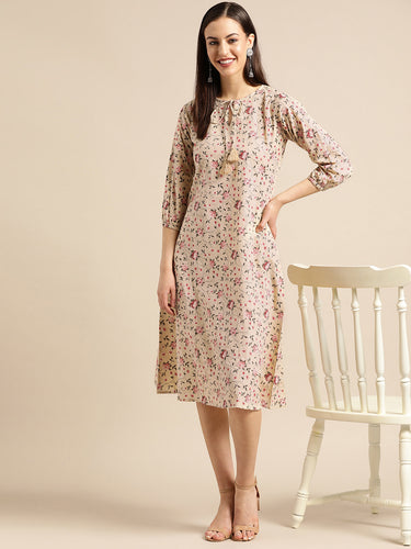 Queen ellie Women Beige & Red Floral Print A-Line Dress