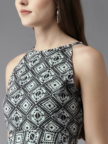 Queen ellie Women Black & Off-White Printed Fit & Flare Dress