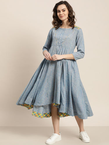 Queen ellie Women Blue Self Design Yarn Dyed Flared A-Line Dress
