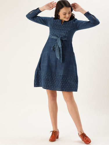 Queen ellie Women Blue Indigo Hand Block Print A-Line Dress with Tie-Up Detail & Cuffed Sleeves