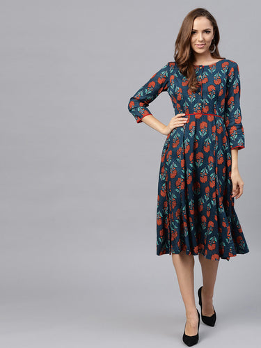 Queen ellie Women Teal Blue Printed Fit & Flare Dress