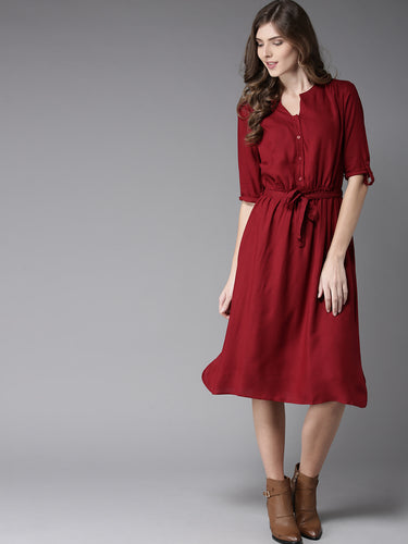 Queen ellie Women Maroon Solid Midi A-Line Dress