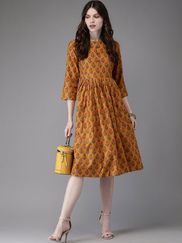 Queen ellie Women Mustard Yellow Printed A-Line Kurta