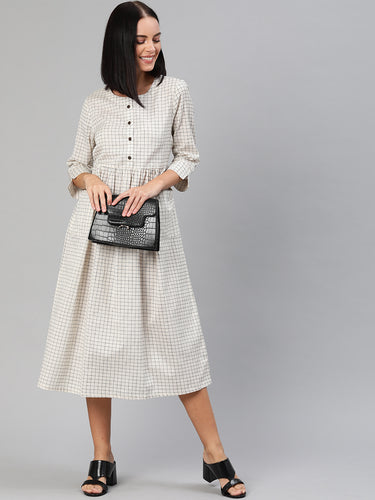Queen ellie Women Off-White & Black Checked Gathered Fit and Flare Dress with Pockets
