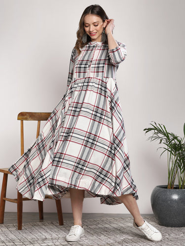 Queen ellie Women Off-White & Black Checked Midi A-Line Dress