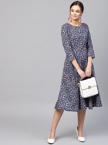Queen ellie Women Navy Blue & Pink Printed Fit and Flare Dress