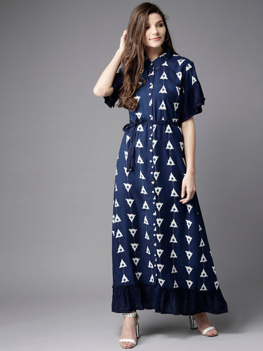 Queen ellie Women Navy Blue & White Printed Maxi Shirt Dress