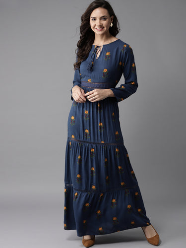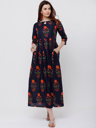 Queen ellie Women Navy Blue Floral Printed Ethnic Maxi Dress