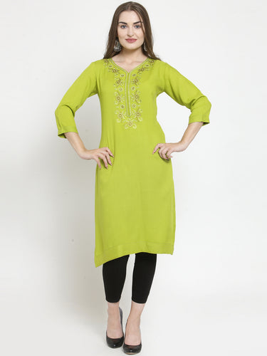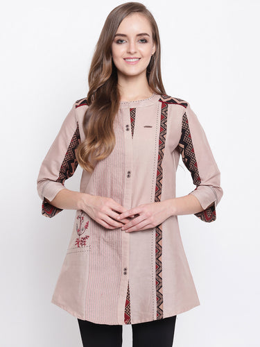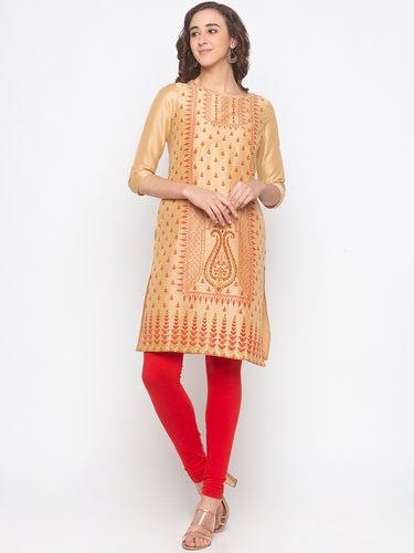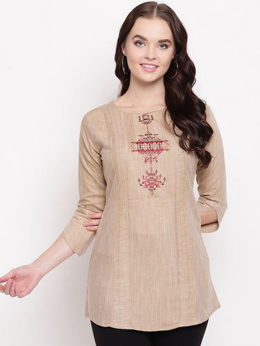 Queen ellie Women Beige Embroidered A-Line Kurti