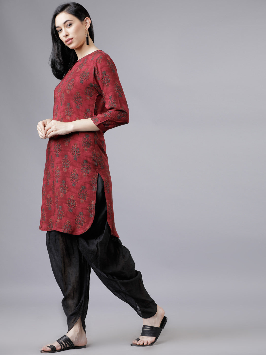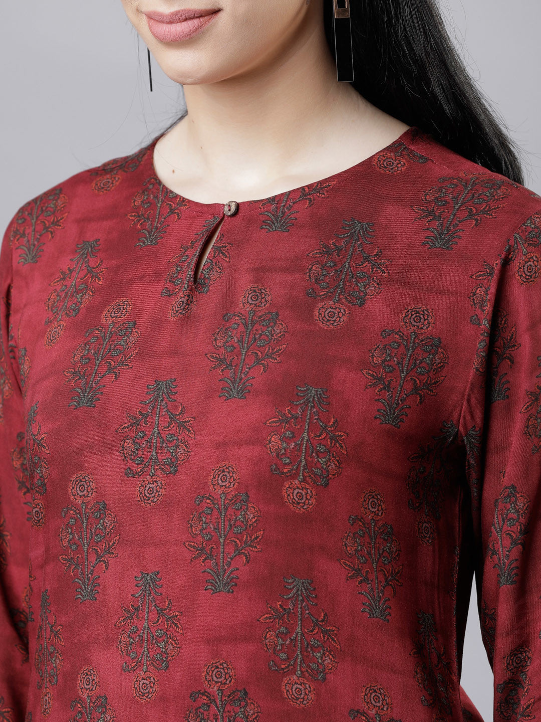 Maroon printed tunic, has a round neck, three-quarter sleeves, chest pocket detail