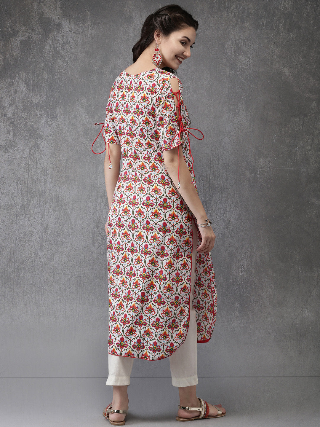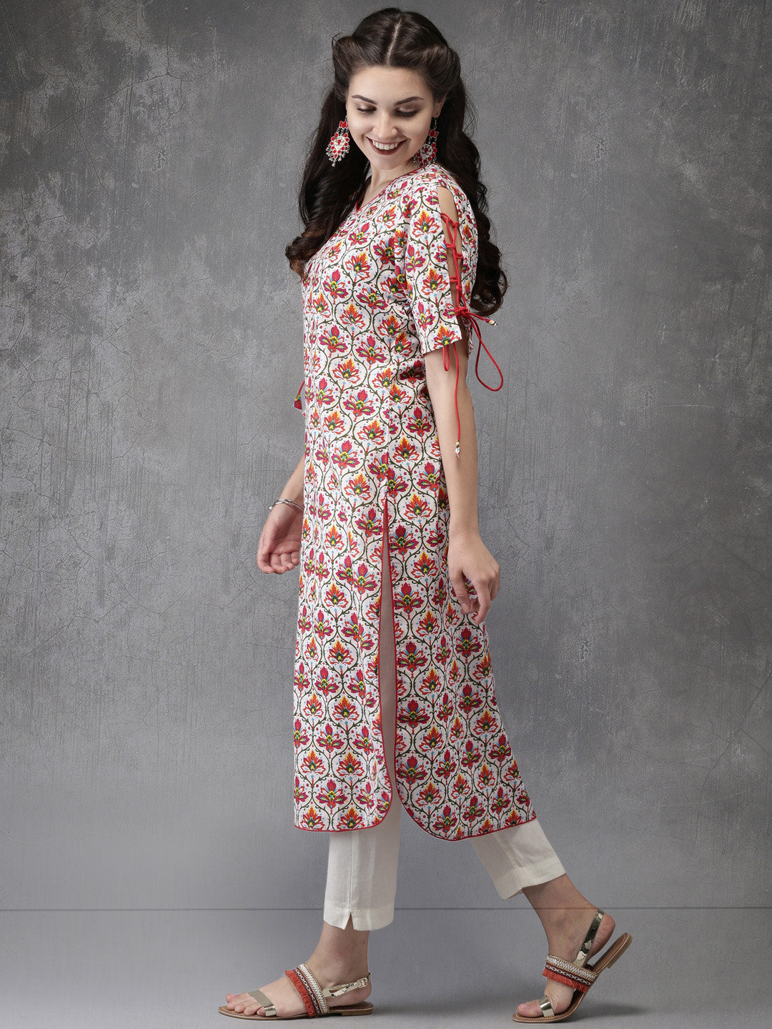 White and red printed straight kurta, has a V-neck, short sleeves, curved hem, side slits